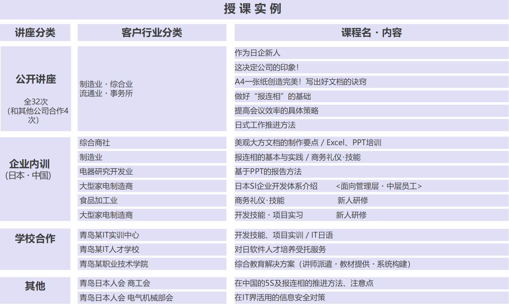 富佳通過多年的業(yè)務(wù)經(jīng)驗(yàn),我們在為眾多客戶提供人才培養(yǎng)支援服務(wù)的過程中積累了豐富的咨詢經(jīng)驗(yàn)和技能。提供面向新員工、干部員工的企業(yè)內(nèi)部培訓(xùn),我們擁有充實(shí)的課程庫,可以按照顧客的需要提供最合適的課程。